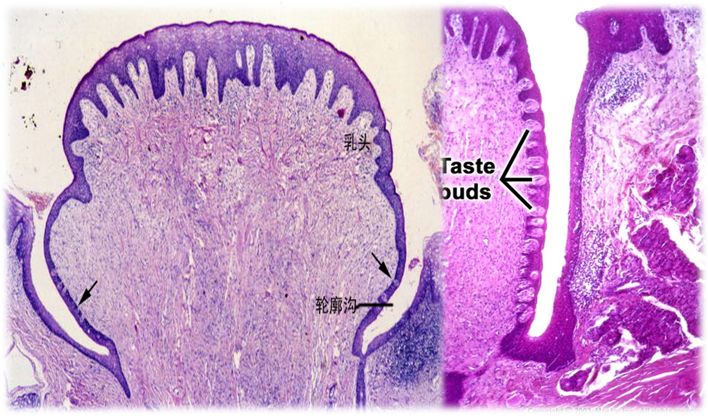 ③乳头的表面上皮有角化,侧壁即轮廓沟上皮无角化。