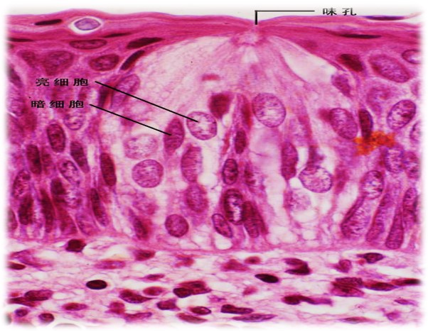LM:是位于上皮内的卵圆形小体,长约80um,厚约40um。基底部位于基底膜上、表面由角质形成细胞覆盖、中央形成圆孔即味孔通于口腔。由粗大的亮细胞和细长的暗细胞组成(图5.2-9)。近味孔处的细胞顶部细胞质有指状突起称为味毛。