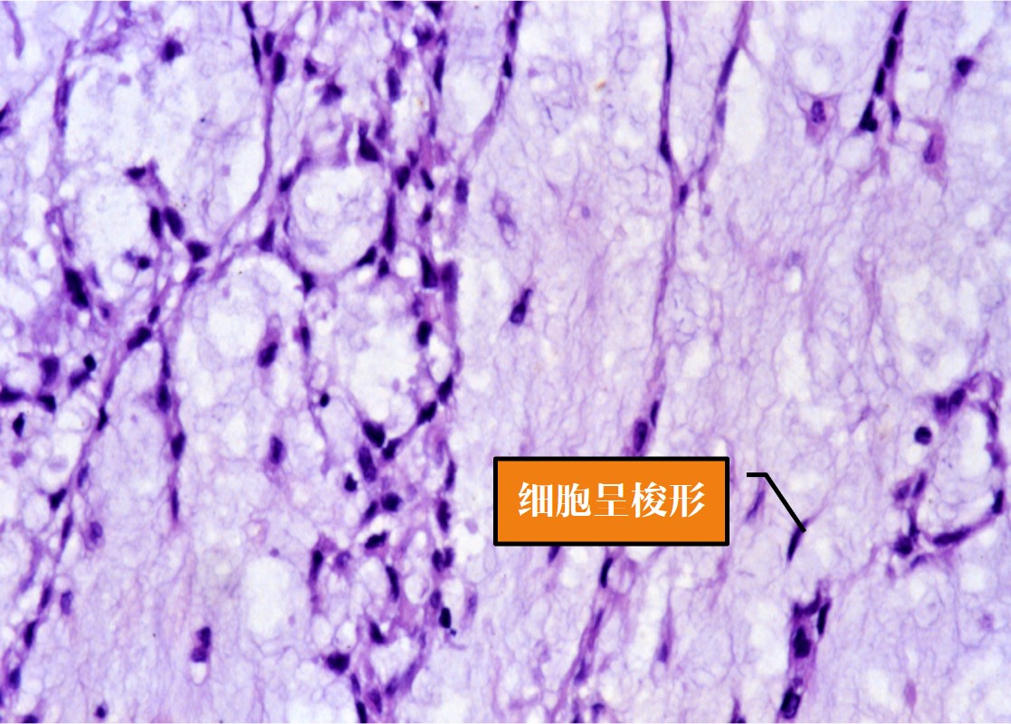 黏液样组织(图12.2-4):细胞呈星形或梭形,排列疏松,连成网状,为结缔组织性黏液。