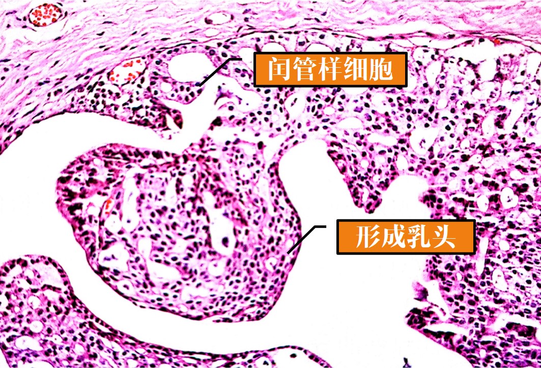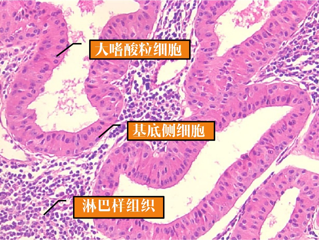 囊腔内衬上皮由双层细胞构成,腔面侧为大嗜酸粒细胞,柱状上皮细胞;排列呈栅栏状,基底侧细胞较小,呈扁平状或立方状。