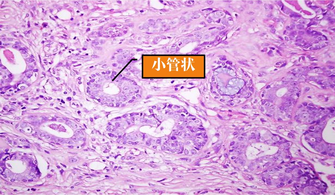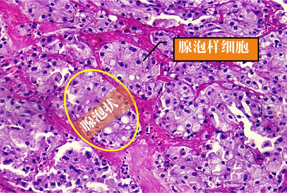 肿瘤中部分肿瘤细胞含有酶原颗粒,呈浆液性腺泡细胞分化,肿瘤中可含有闰管细胞,为低度恶性肿瘤。