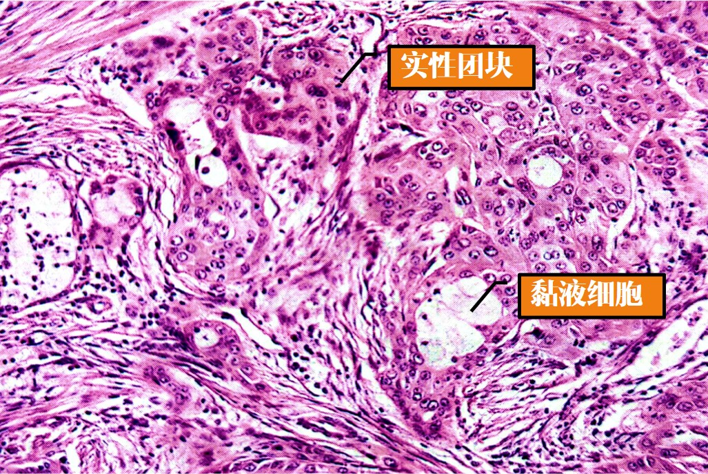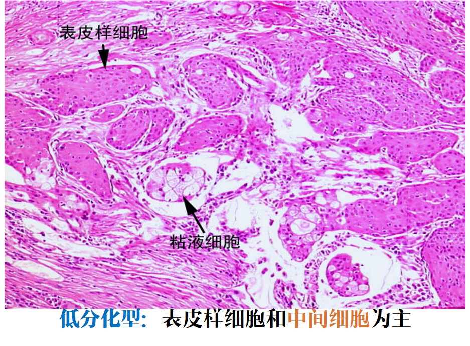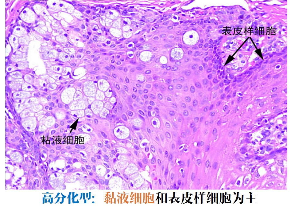 肿瘤由表皮样细胞、黏液细胞和中间细胞构成。