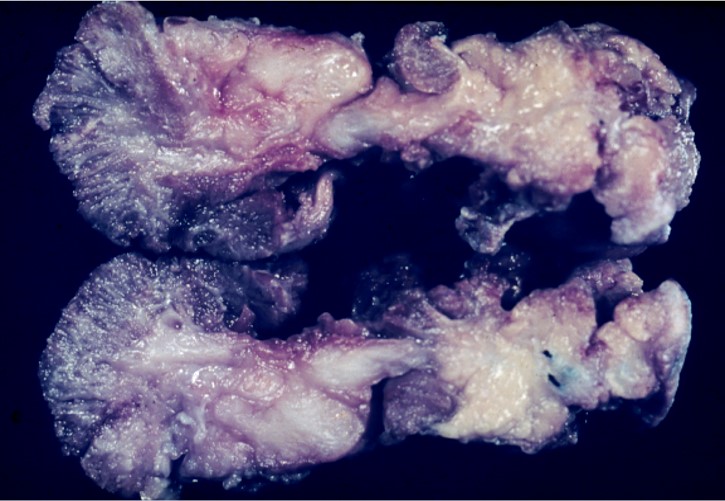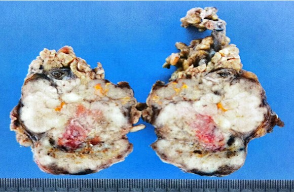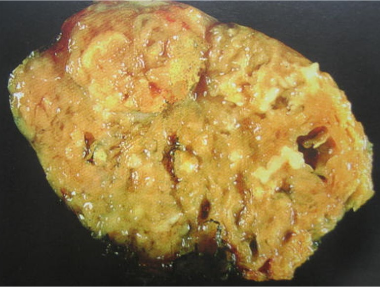 圆形或结节状,无包膜、呈浸润性生长,界不清;切面灰白,可见出血和囊性变(图12.2-12)。