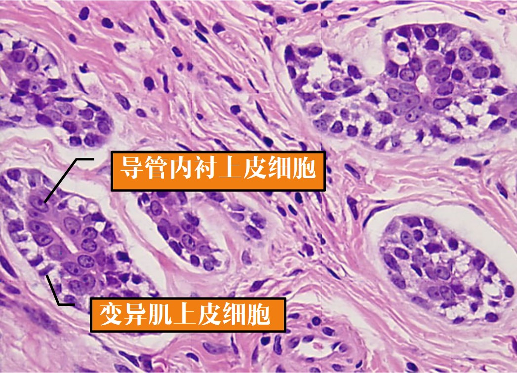 变异肌上皮细胞:扁平状、梭形或不规则。