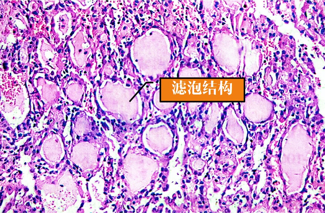囊腔内含嗜伊红性分泌物,偶有胆固醇结晶、变性上皮细胞和淋巴细胞。