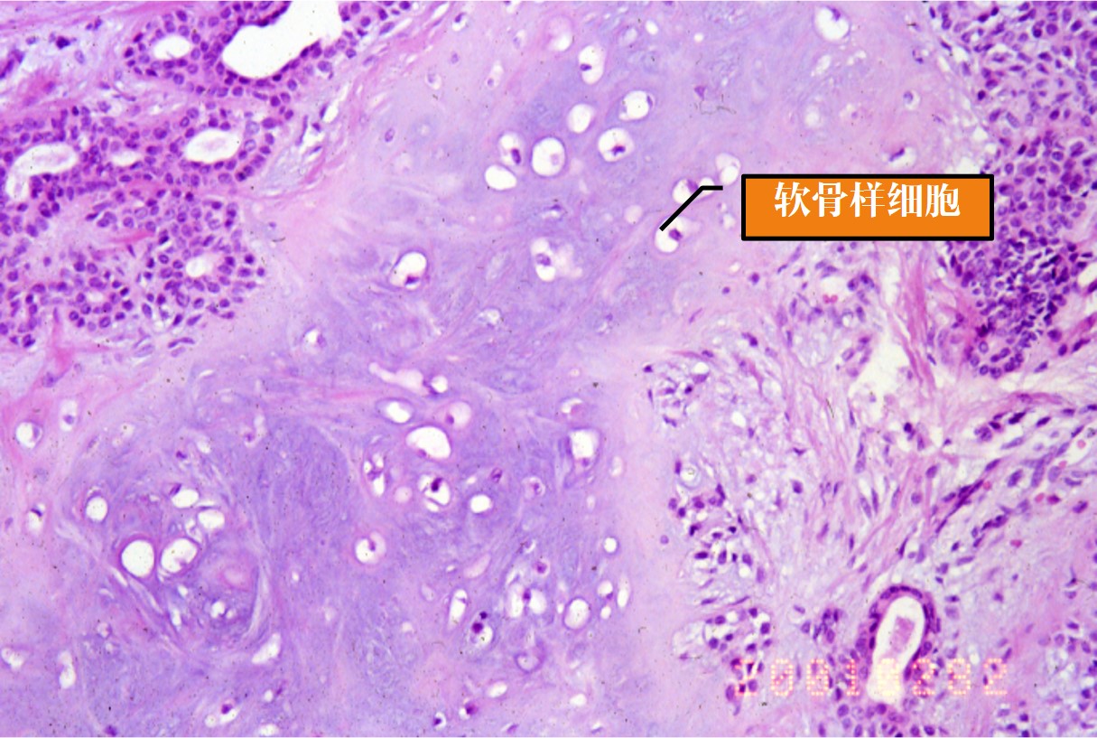 肿瘤细胞的类型多样,组织结构复杂。基本结构为腺上皮、肌上皮、黏液、黏液样组织和软骨样组织。