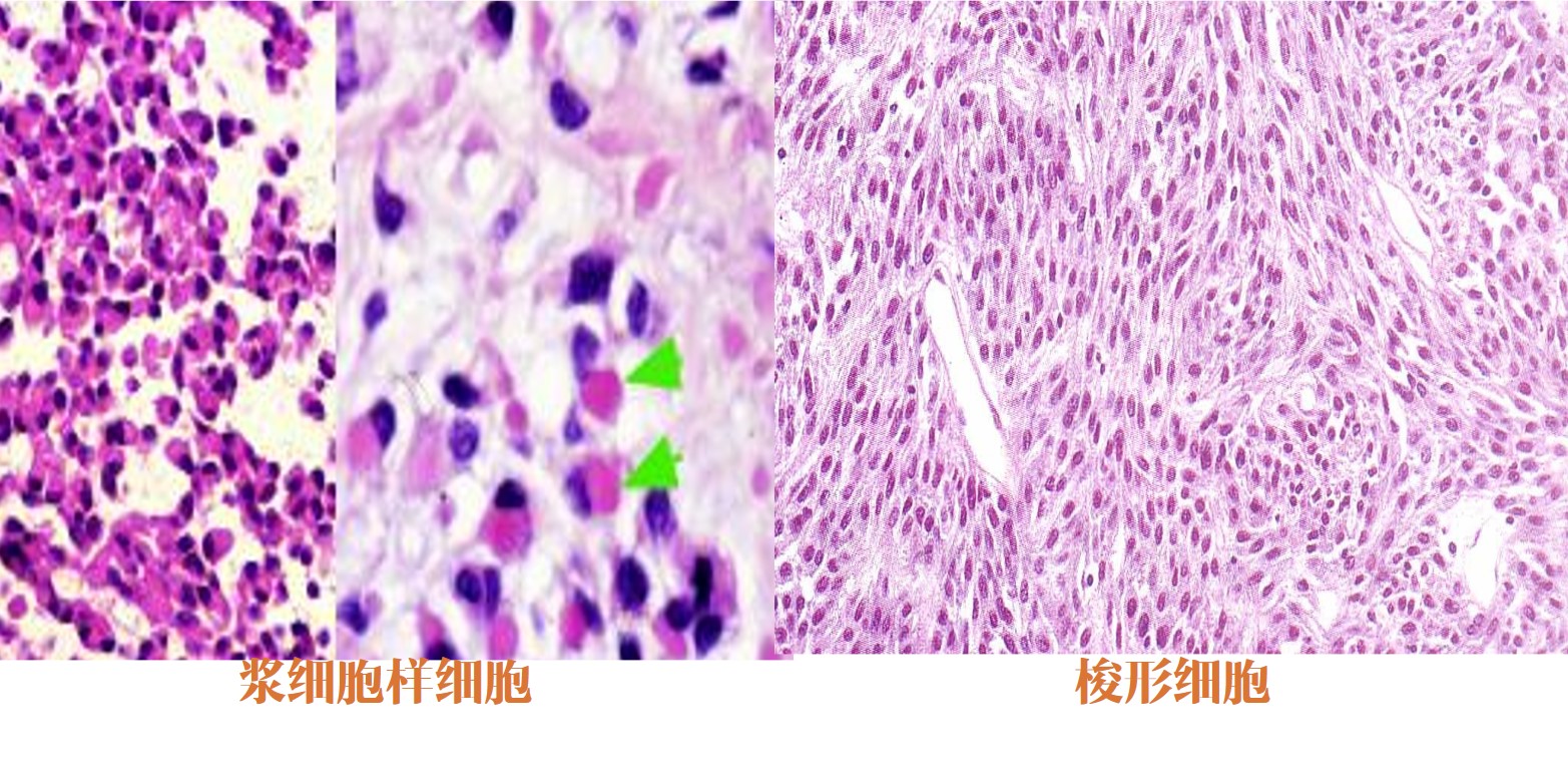 肿瘤细胞形态多样,包括梭形细胞、浆细胞样细胞、上皮样细胞、透明细胞。