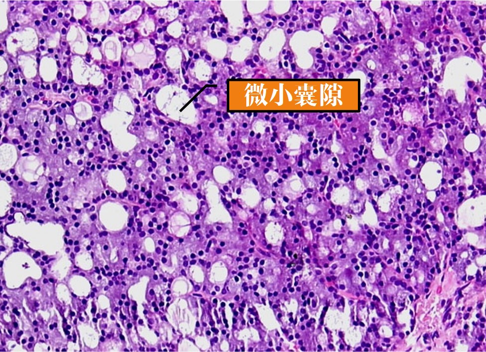 镜下,含有腺泡样细胞,闰管样细胞,空泡样细胞,透明细胞和非特异性腺样细胞。