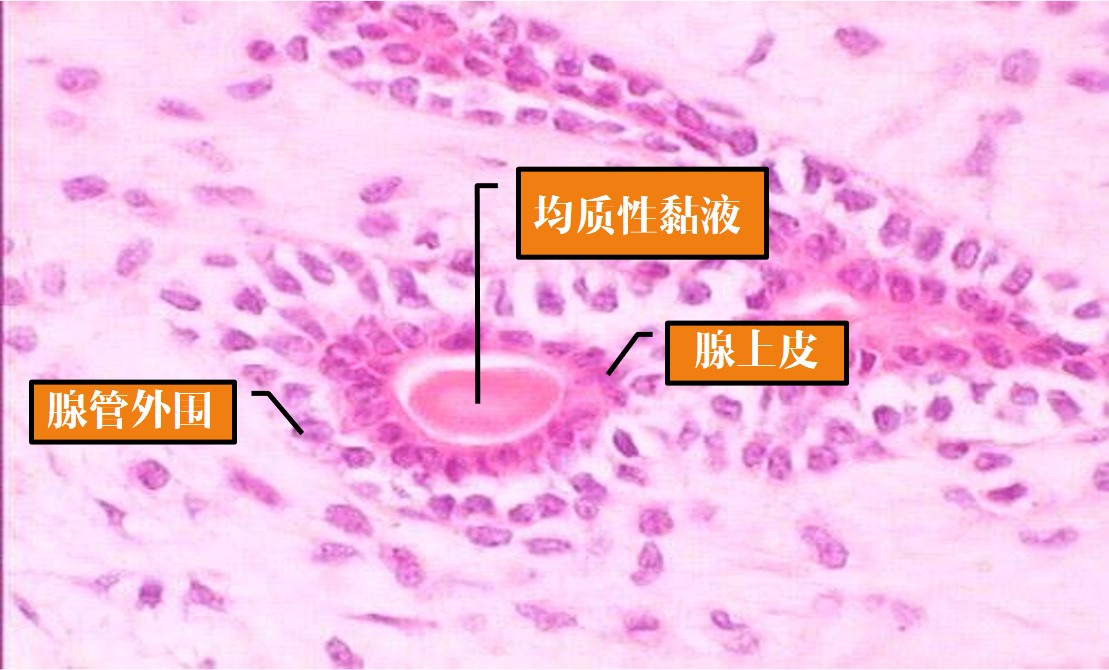 腺管样结构(图12.2-2):腺上皮呈立方或矮柱状,核圆形,主要为导管样结构形成细胞。腺管外围为梭形的肌上皮细胞或柱状的基底细胞。管腔内有粉染的均质性黏液。有的管腔扩张,形成囊腔,囊壁为扁平细胞。