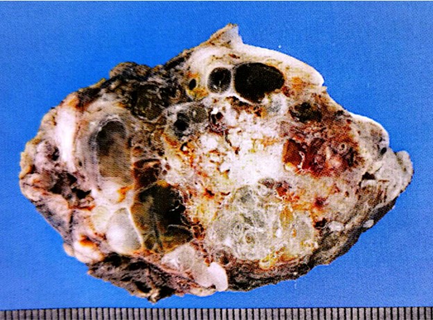 圆形或卵圆形肿物,直径2~100px,质软;包膜完整,界限清楚;剖面常见大小不等囊腔,内含液体,囊腔内可有乳头状突起(图12.2-6);少数为实性,灰褐色或暗红色。