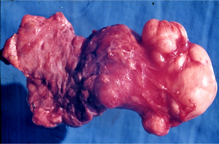 圆形或结节状;包膜完整或不完整;切面实性,灰白色或黄褐色,有时含有半透明胶冻状物。