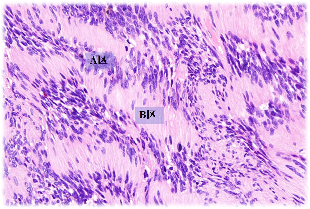 光镜下:可见两种不同的组织学结构,A区,梭形的施万细胞呈旋涡状或栅栏状排列,B区瘤细胞稀少,排列成疏松的网状结构(图16.1-14)。