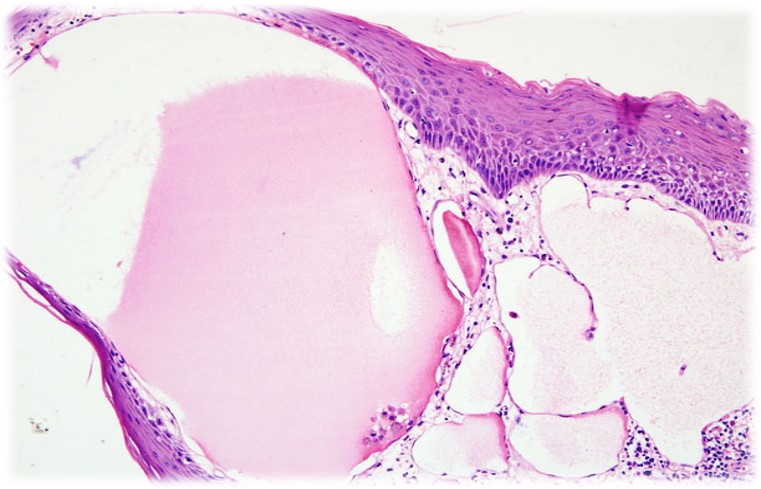 光镜下:以壁薄,大小不等扩张的淋巴管为特点,内衬扁平内皮细胞,腔内空或含有蛋白样液体(图16.1-11)。