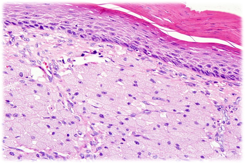 光镜下:黏膜上皮乳头状增生,表面被覆增生的复层鳞状上皮,间质有淋巴细胞和浆细胞为主的慢性炎症细胞浸润。