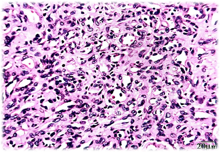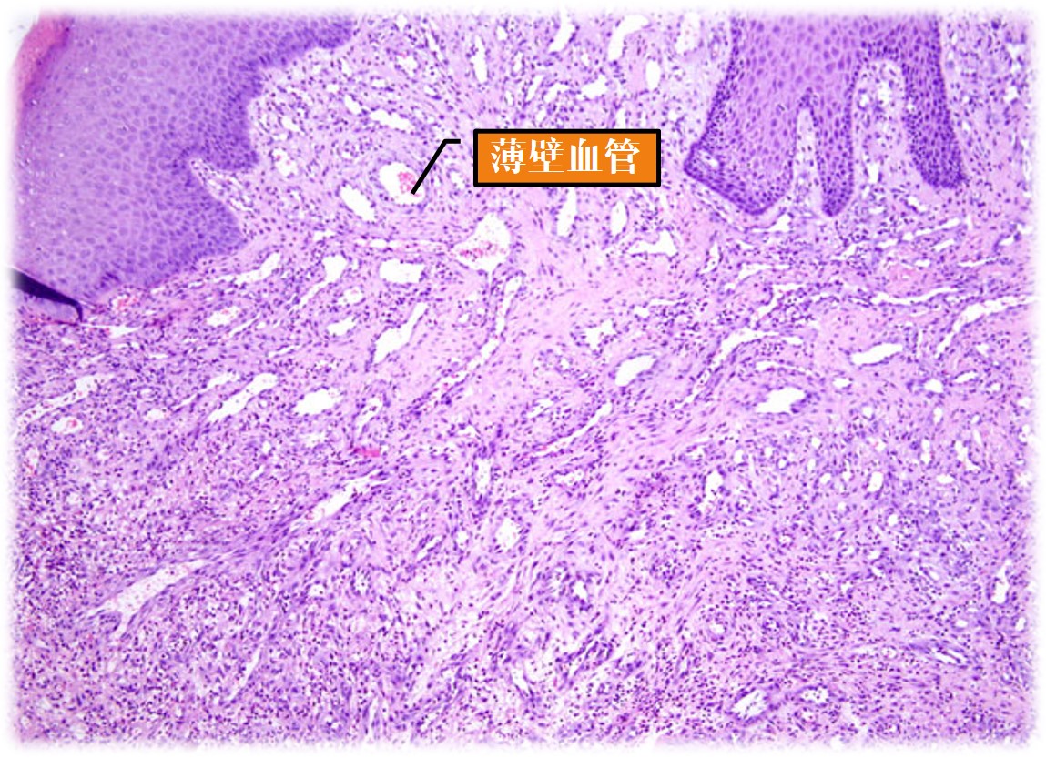光镜下:血管内皮细胞增生呈实性片状或条索,或弥散的薄壁小血管,间质水肿,炎细胞浸润(图16.1-4)。