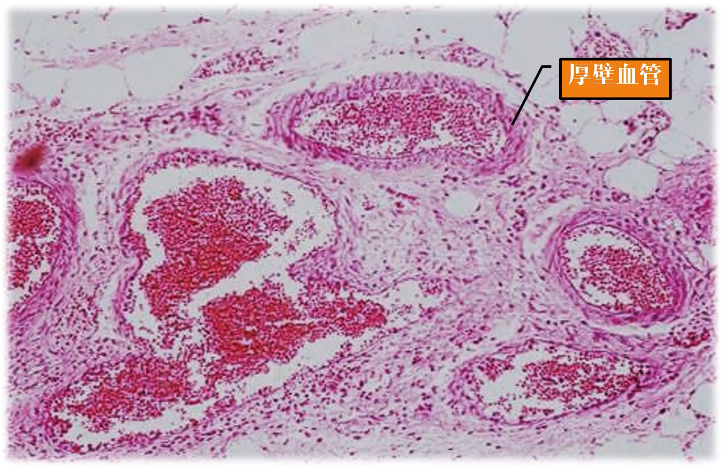 光镜下:病变主要由厚壁血管组成,被覆单层内皮细胞,还有少量薄壁扩张血管和不等量的黏液(图16.1-10)。