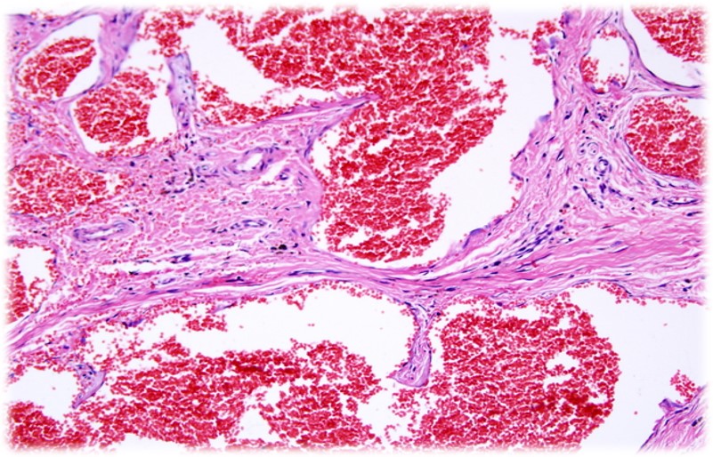 光镜下:病变由大量薄壁血管构成,血管腔大小不规则;管腔相互吻合且充满血液;管壁内衬一层扁平的内皮细胞,管壁外一般无平滑肌纤维(图16.1-9)。