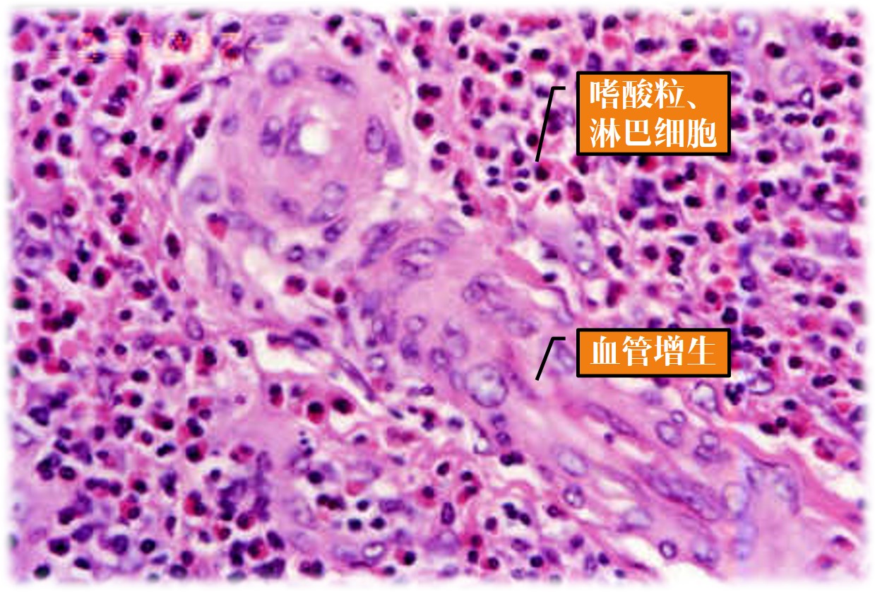 为肉芽肿结构,其主要特征一是嗜酸性粒细胞和淋巴细胞灶性或弥漫性浸润;二是病变血管增生(图16.1-15)。