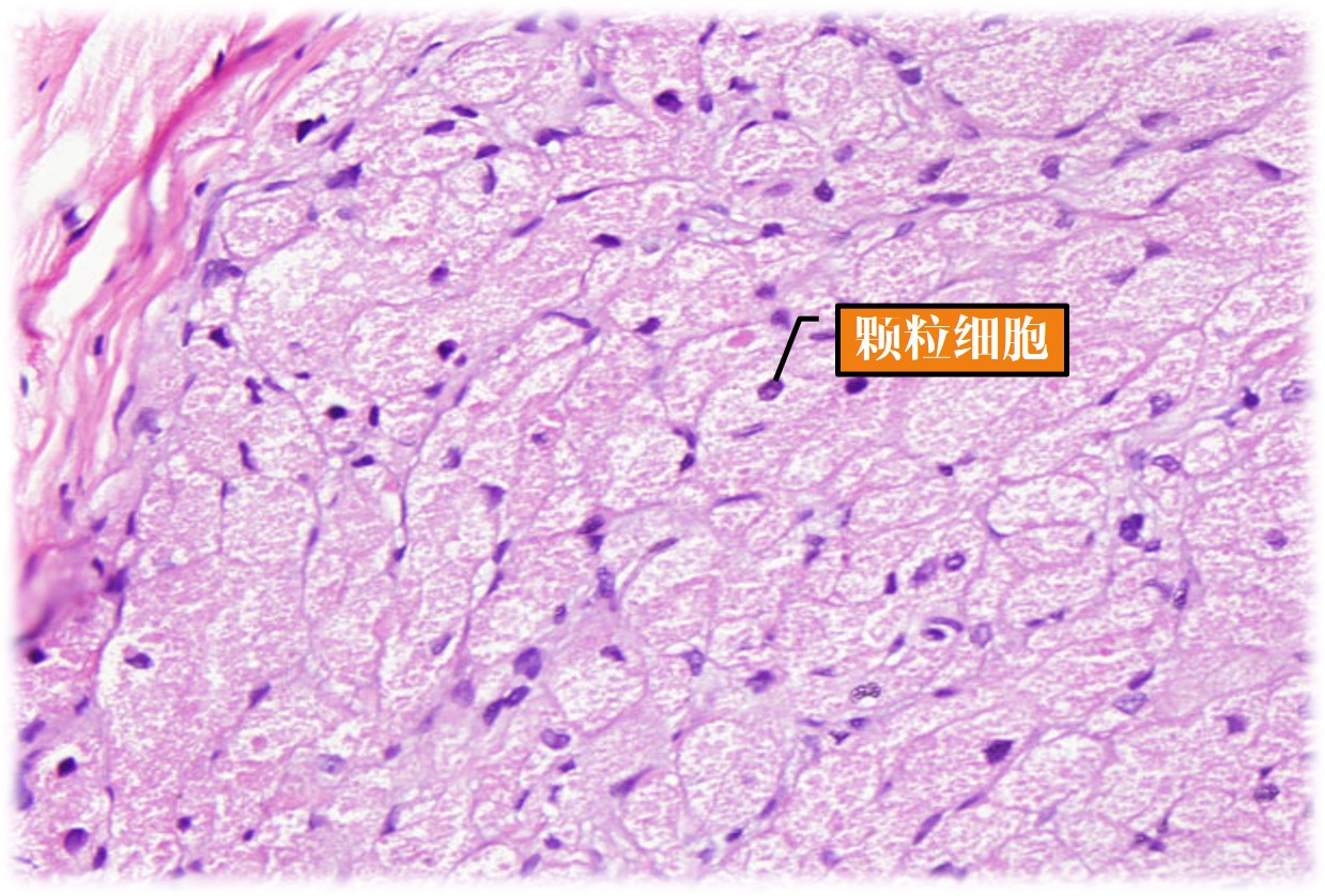 肿瘤由丰满的含嗜酸性颗粒细胞构成。细胞呈多边形,胞核小、深染,细胞膜不明显,胞质含大量均质颗粒(图16.1-13)。