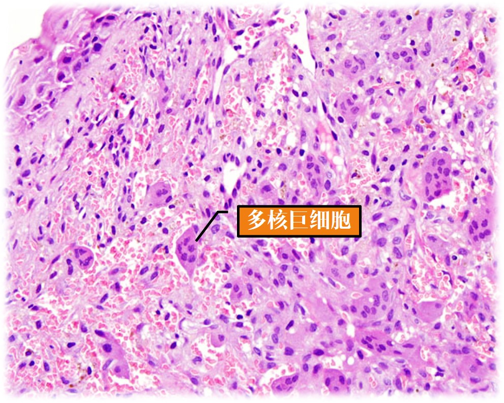 光镜下:富于血管和细胞的间质内含有多核破骨细胞样细胞,呈灶性聚集(图16.1-5)。
