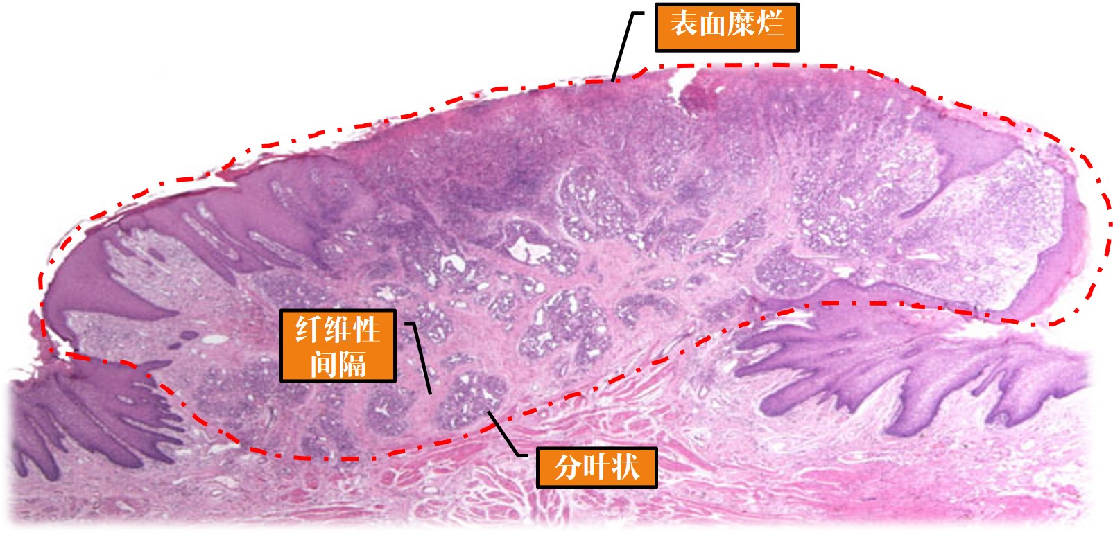 光镜下:病变呈息肉状,突起于黏膜,表面糜烂,由纤维性间隔分隔病变,呈分叶状形态(图16.1-8)。