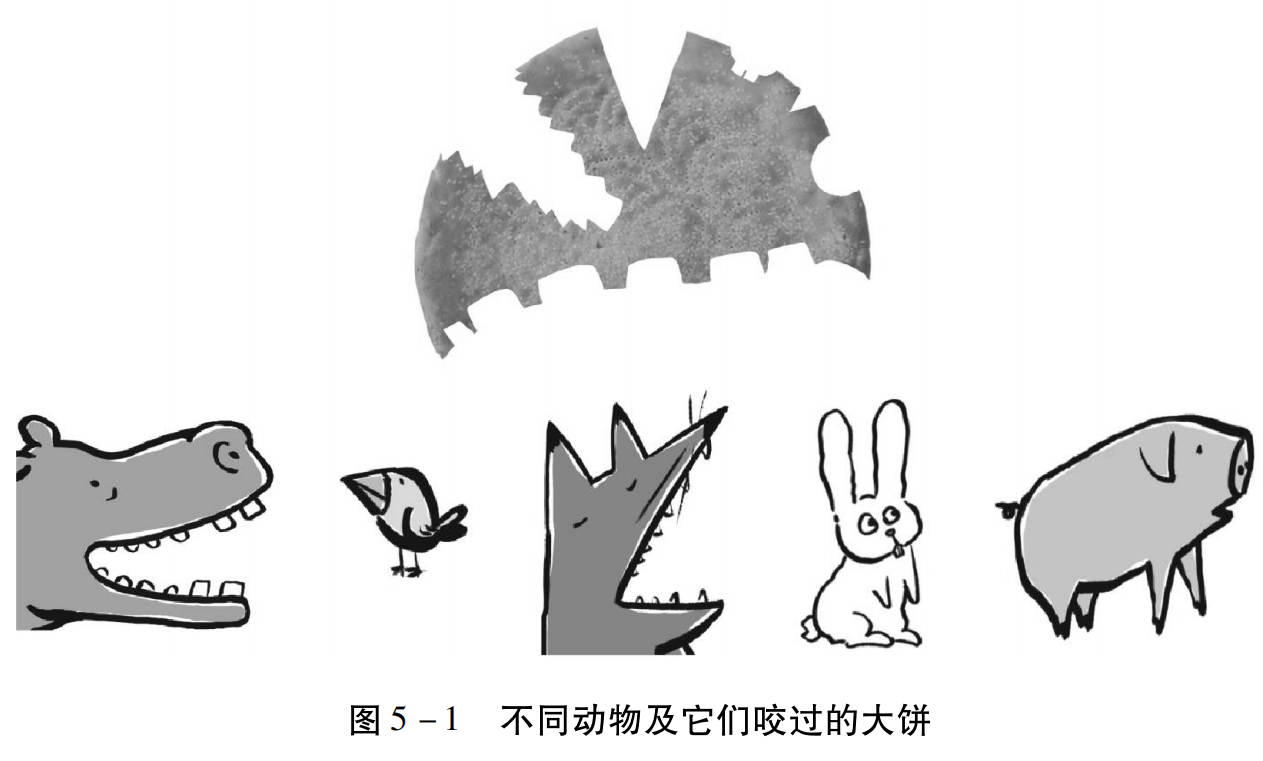 赖老师讲完故事,说:“小朋友们,小猪非常伤心,也非常疑惑,到底是谁偷吃了小猪的大饼呢?笨笨的小猪始终没想明白,那谁能够帮小猪找到凶手呢?”随后,赖老师根据故事的线索,设计一个“牙印找主人”的游戏,出示不同的动物以及被不同动物咬过的大饼的卡片(见图5-1),请幼儿看一看、找一找这些牙印都是哪些动物咬出来的。