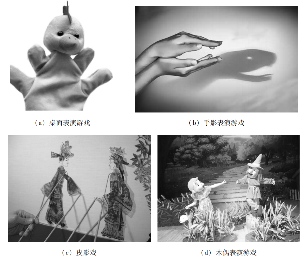(1)根据表演主体的不同,表演游戏可分为直接表演游戏和间接表演游戏。直接表演游戏是指由幼儿自身根据故事脚本进行装扮表演的游戏活动。间接表演游戏是指通过间接操控玩具、道具充当故事角色进行表演的游戏活动。根据表演形式中所使用的辅助材料的不同,间接表演游戏又可分为桌面表演游戏、木偶表演游戏和影子戏(见图3-1)。在桌面表演游戏中,幼儿使用手偶、纸偶等小玩具在桌面上替代角色,辅以对话、独白进行表演。幼儿玩的影子戏有头影、手影和皮影。在木偶表演游戏中,幼儿利用木头、瓶子、盒子、蛋壳、泥塑等材料做成的木偶替代角色进行表演。