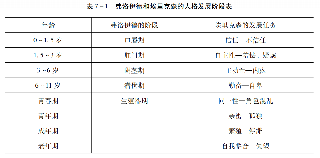 埃里克森把人格发展划分为八个阶段,每个阶段都有自己特定的发展任务,见表7-1。这种发展任务表现为两极性的矛盾,或者说表现为正、负两种发展方向:如果任务解决得好,就形成理想的人格;如果任务解决得不好,则形成与理想人格相反的另一种人格。在童年期的几个阶段,儿童主要通过游戏来解决这些矛盾,并控制矛盾所导致的伤害,即游戏可以调节人格发展的阶段冲突,并掌握冲突中的情感危机。