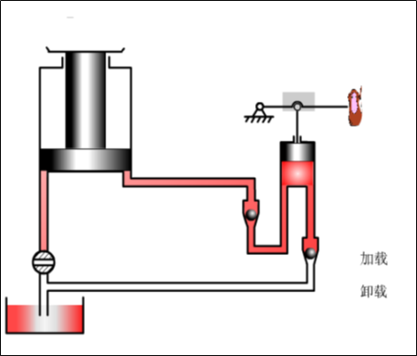 组成:杠杆、小活塞、大活塞、油管、单向阀、油箱