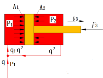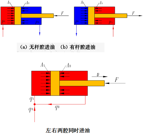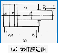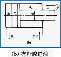 由于A1>A2,故F1>F2,V1<V2,即活塞杆伸出时,推力较大,速度较小;活塞杆缩回时,推力较小,速度较大。