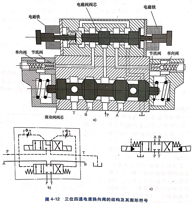 大、中型液压设备中,当通过阀的流量较大时,作用在滑阀上的摩擦力和液动力较大,此时电磁换向阀的电磁铁推力不够,需要用电液换向阀来代替电磁换向阀。
