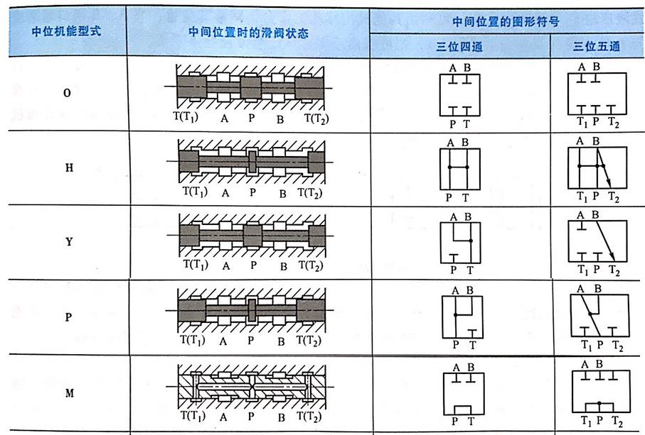 对于各种操纵方式的三位四通和五通的换向滑阀,阀芯在中间位置时各油口的连通情况称为换向阀的中位机能。