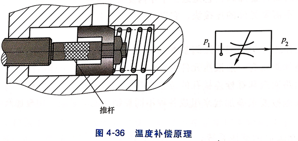 基本原理:温度补偿调速阀与普通调速阀的结构基本相似,主要不同是,节流阀内有一根温度补偿杆,它是用热膨胀系数较大的聚氯乙烯塑料制成。当温度升高时,补偿杆伸长,节流口关小,使流量保持不变。