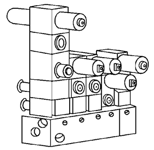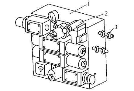 把几个板式安装的阀用螺钉固定在一个带有内部孔道通道体的不同侧面上,构成一个油路单元集成块,集成块中的孔道与各阀沟通组成回路,液压系统由若干个集成块组成。由于拆卸阀时不用拆卸与它们相连的其他元件,因此这种连接方式应用较广。