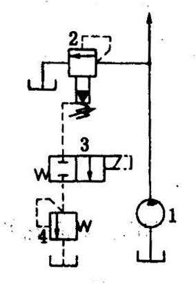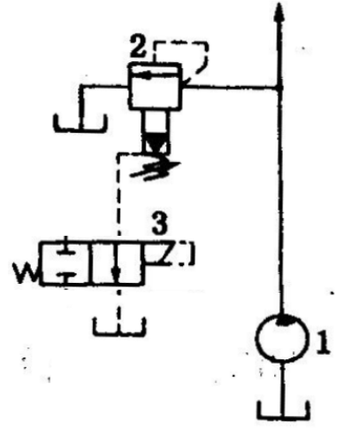 回路中先导式溢流阀2的远控口直接与两位两通电磁阀3相连,即远控口直接接通油箱,此时,泵输出的油液在低压下经溢流阀2流回油箱,实现卸荷。