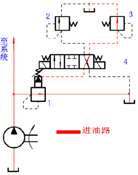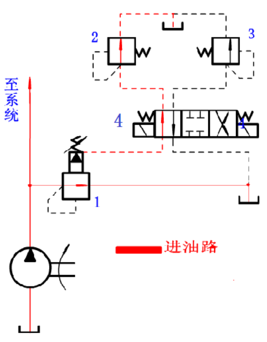 当阀3得电后处于右位时,如图2所示,系统压力由阀4调定。