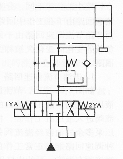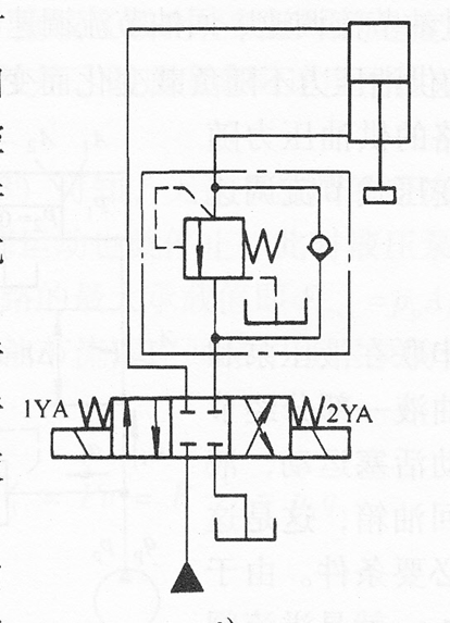 这种回路当活塞向下快速运动时功率损失大,锁住时活塞和与之相连的工作部件会因单向顺序阀和换向阀的泄漏而缓慢下落;