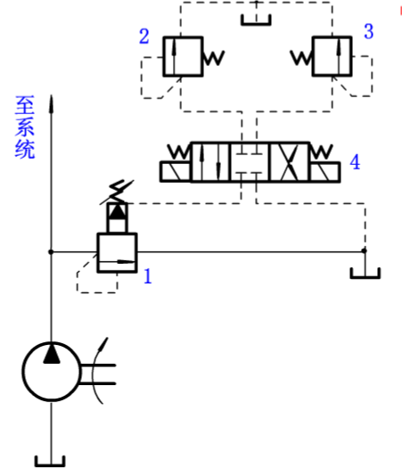 当阀4的两电磁铁均不带电时,如图所示,阀4的中位接入回路,即阀4关闭不通,系统压力由阀1调定。