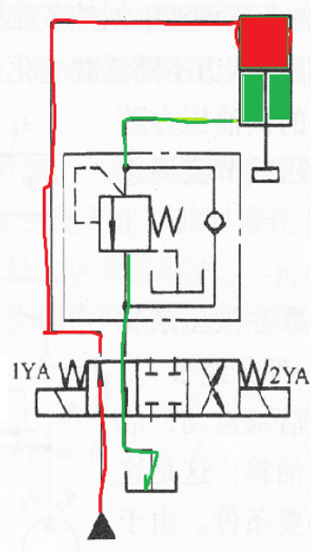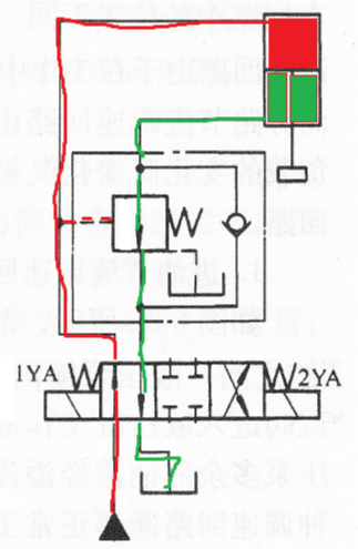 当1YA得电三位四通电磁换向阀左位工作时,液压油进入液压缸的上腔,活塞下行,回油路由于有单向顺序阀,因此就存在着一定的背压;