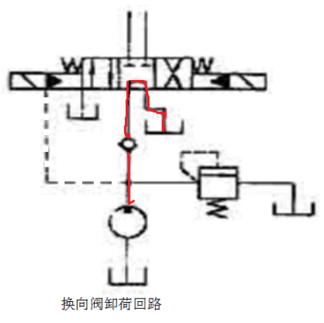 当换向阀处于中位时,泵输出的油液经单向阀直接流回油箱,此时泵的工作压力很低。