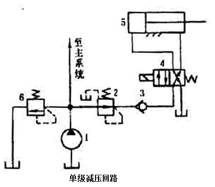 最常见的减压回路是通过定值减压阀与主油路相连,如图所示,回路中的阀2。