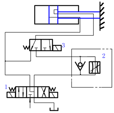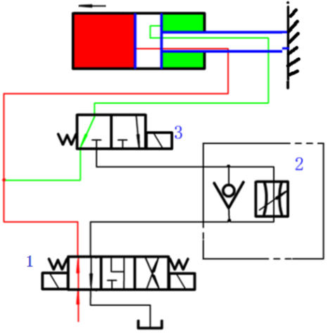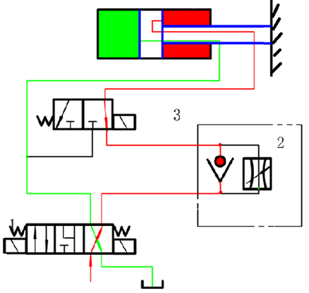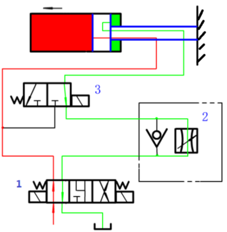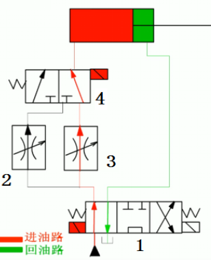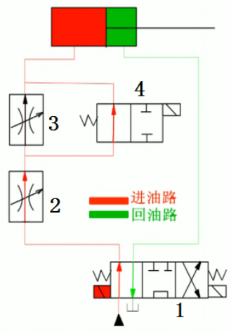 阀1切换至右位后,如图所示,缸快退。