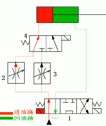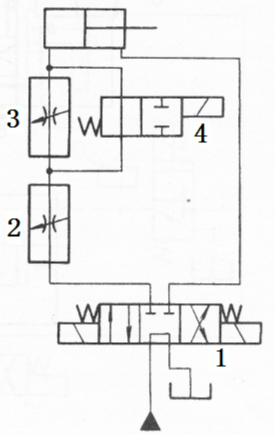 当换向阀1和换向4左位接入系统时,调速阀3被换向阀4短接;输入液压缸的流量由调速阀2控制。