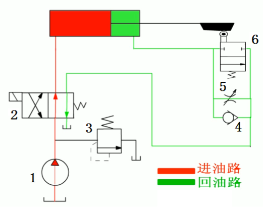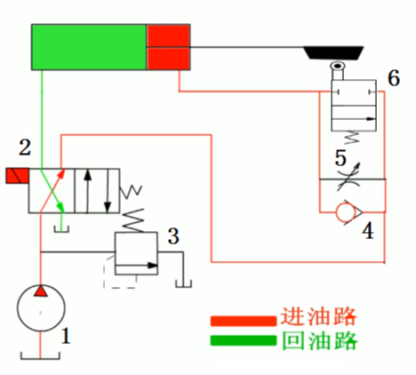 当活塞所连接的挡块压下行程阀6时,如图所示,行程阀关闭,液压缸有杆腔的油液必须通过节流阀5才能流回油箱,活塞运动速度转变为慢速工进。