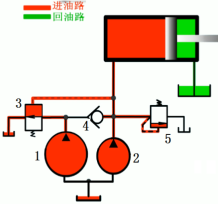 工作行程时,系统压力升高,打开卸荷阀3使大流量泵1卸荷,由泵2向系统单独供油,单向阀4在系统压力油作用下关闭,系统的压力由溢流阀5调整。