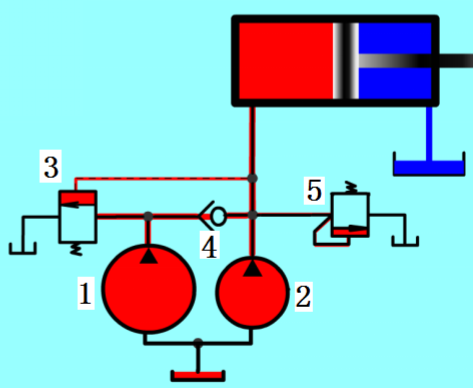 在快速运动时,泵1输出的油液经单向阀4与泵2输出的油液共同向系统供油。