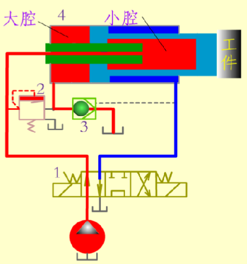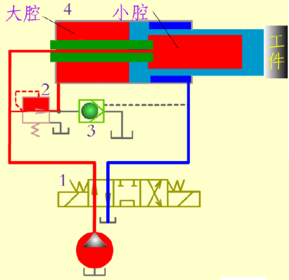 当活塞推动工件时,由于负载加大,压力升高,打开顺序阀2,高压油进入大腔同时关闭单向阀3,此时活塞杆在压力油作用下继续外伸,但因有效面积增大,速度变慢而使推力增加。
