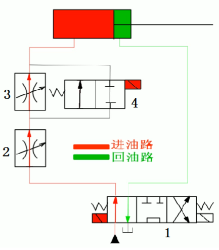 当阀4右位接入回路时,油液通过调速阀2、3进入液压缸,由于通过调速阀3的流量调得比调速阀2小,所以输入液压缸的流量由调速阀3控制。