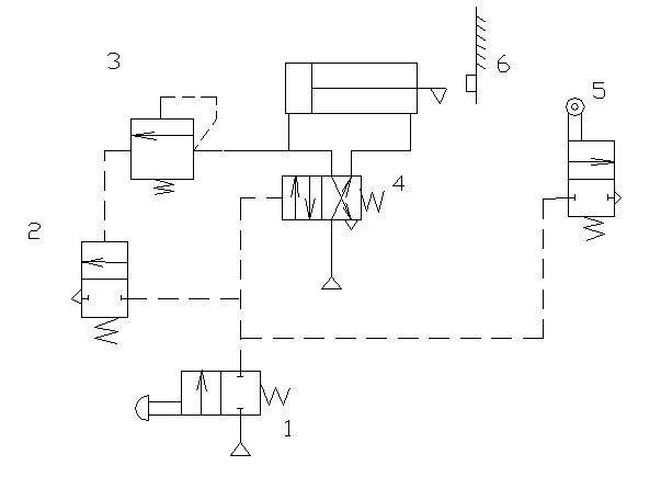 按下开关1,阀4左位,活塞杆伸出。遇到障碍6,无杆腔压力升高,顺序阀3打开,换向阀2换向,换向阀4复位,活塞退回。