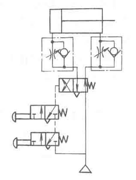 使用两个启动用的手动阀,只有同时按动两个阀才动作的回路,主要为了安全。
